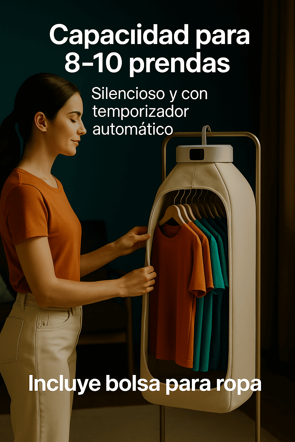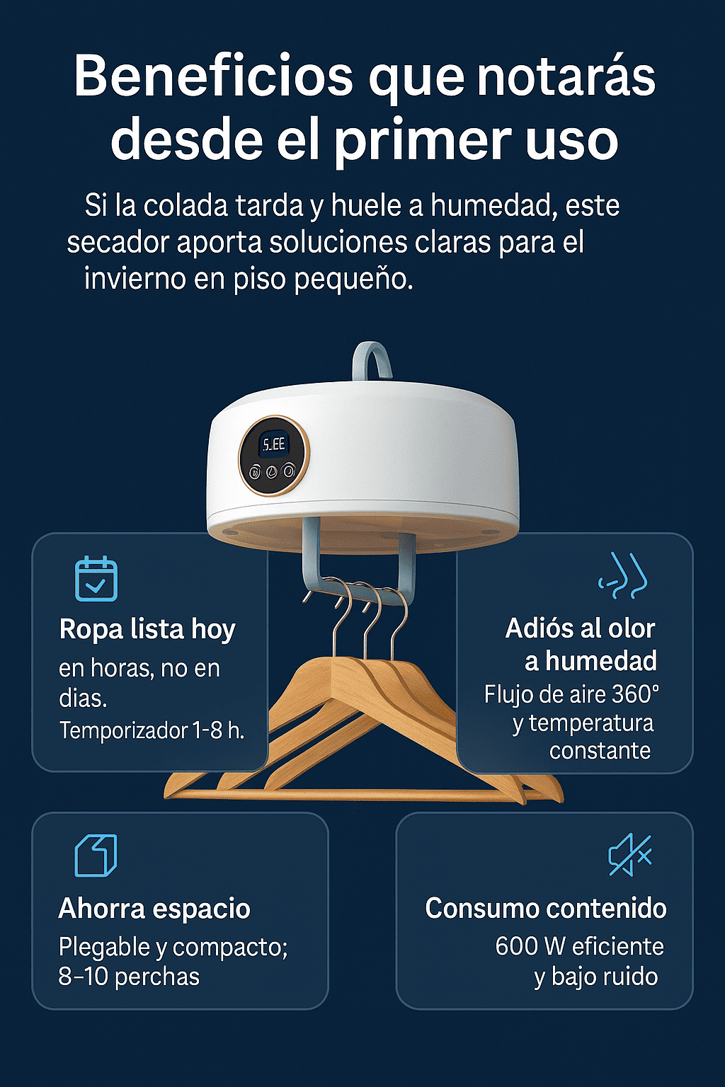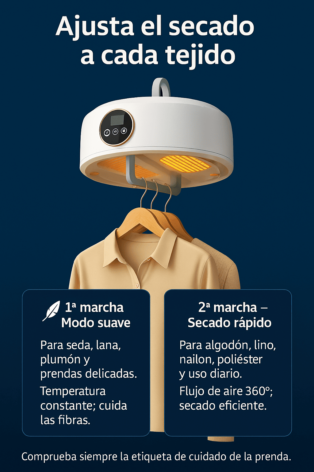 Coloca de 8 a 10 prendas en perchas → cuélgalas en la barra → elige modo suave o rápido → fija el temporizador (1–8 h) → el difusor 360° reparte calor a temperatura constante para un secado uniforme en interior.