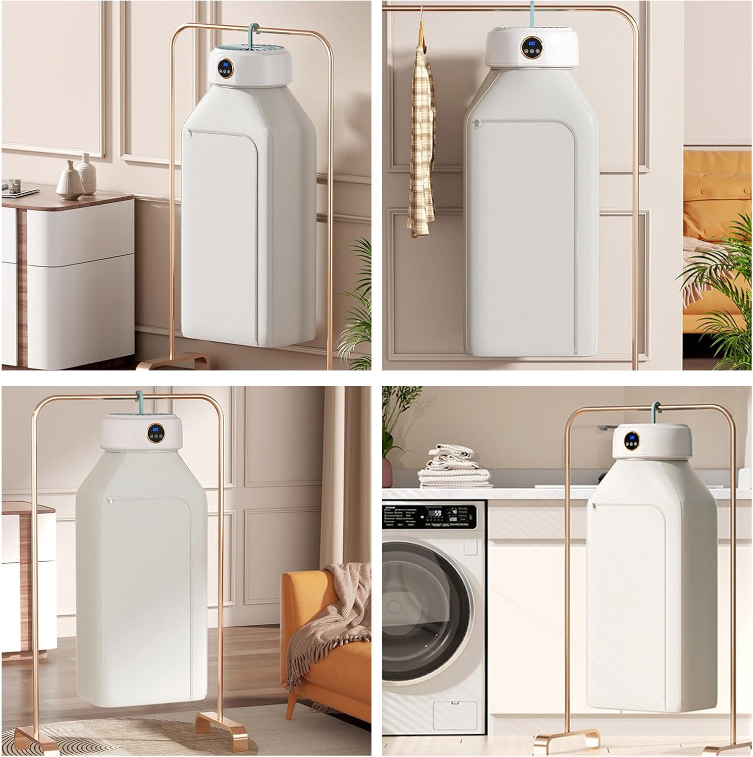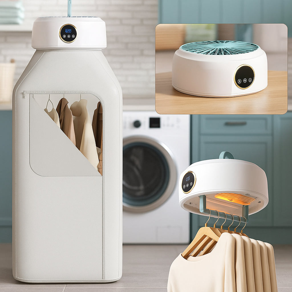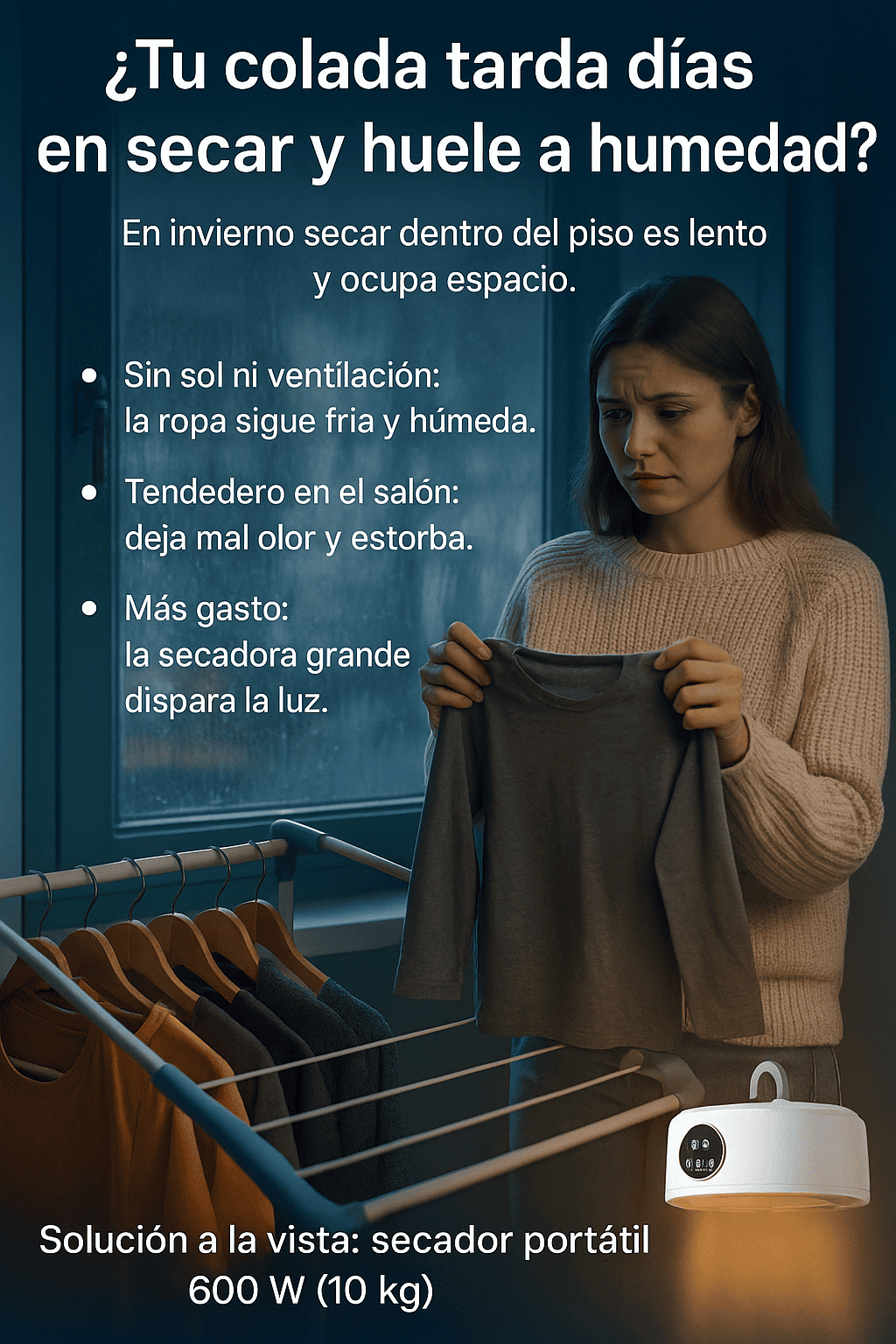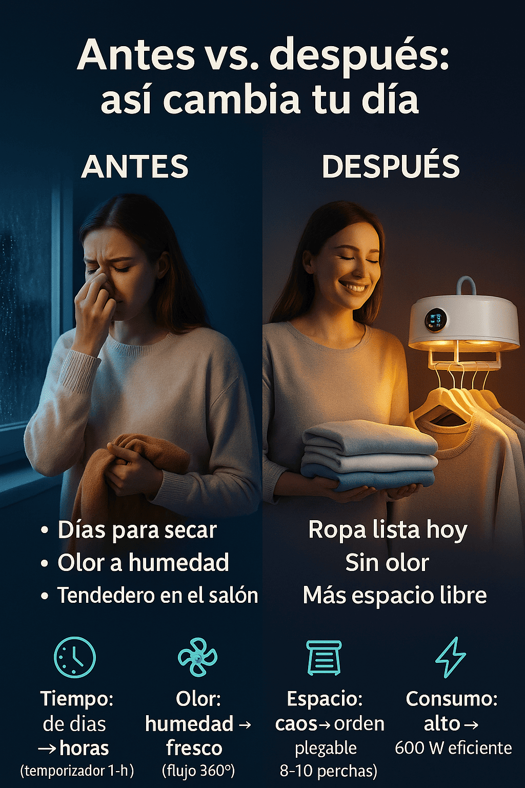 Coloca de 8 a 10 prendas en perchas → cuélgalas en la barra → elige modo suave o rápido → fija el temporizador (1–8 h) → el difusor 360° reparte calor a temperatura constante para un secado uniforme en interior.